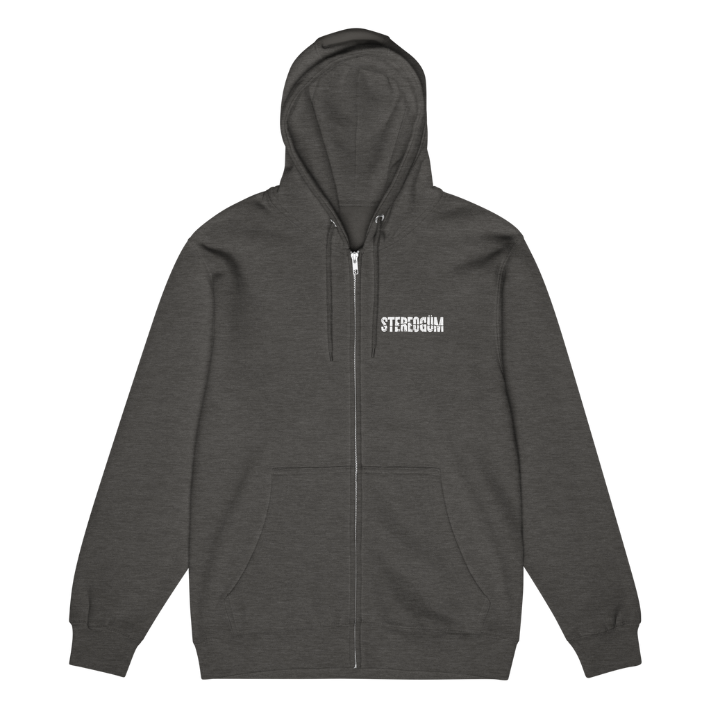 Our lightweight, unisex, zippered hoodie says Stereogüm over your heart awww.